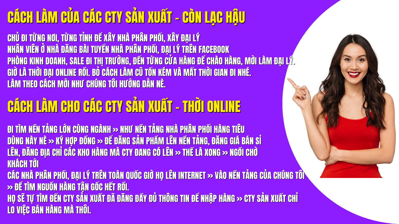 Website này là nền tảng kinh doanh hàng tiêu dùng giúp các Cty sản xuất, tiểu thương bán sỉ tại các chợ thay đổi cách bán hàng phù hợp với thời đại Online. Để kinh doanh hiệu quả hơn, mở rộng hơn, lãi nhiều hơn, mà chi phí ít đi